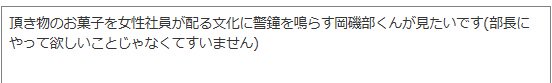 いただいたお題の一つ「頂き物のお菓子を女性社員が配る文化に警鐘を鳴らす岡磯部くんが見たいです」を描きました