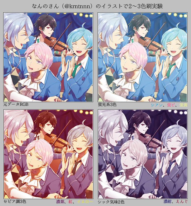 なんのさん(@krntnnn)の奇人絵で2~3色刷実験。インク色次第では2色刷りでもぱっと見フルカラーっぽく見えたりもする?あんスタの場合は制服が濃水色だからシアン版をどう処理するかで印象かなり違ってくる気がするな…実験許可サンクス