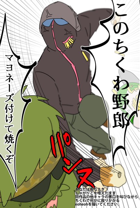 あなたは暇なときじゃがりこを咥えたまま同作品の他キャラの悪口を叫びながらちくわで何かに殴りかかるeoheohを描いてください。 https://t.co/gvMIAEWv9W
