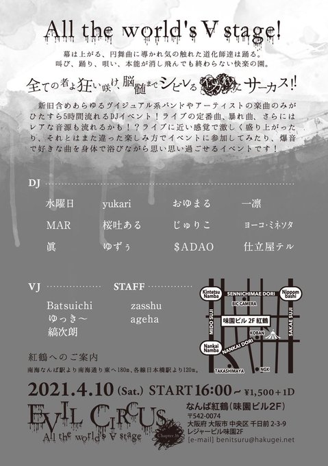 新旧含めメジャー・インディーズを問わずあらゆる国内ヴイジュアル系バンドやアーティストの楽曲のみがひたすら流れるV系楽曲オンリーで構成されたDJイベント!