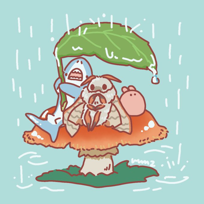 雨やどりするクチバスズメとサメとメンダコ☔🍃 #虫の日 #むしの日 #今日は何の日 #イラスト #サメとメンダコ