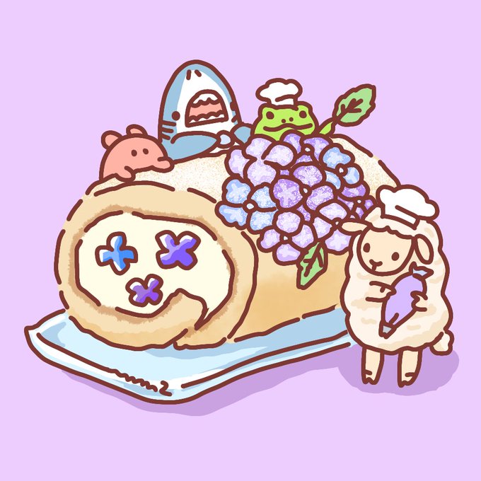 紫陽花ロールケーキ🍰 #ロールケーキの日 #かえるの日 #ひつじの日 #今日は何の日 #イラスト #サメとメンダコ