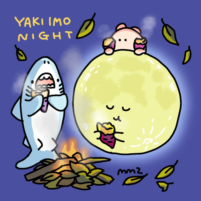 ハンターズムーンと焼き芋ナイト🍠 #イラスト #サメとメンダコ