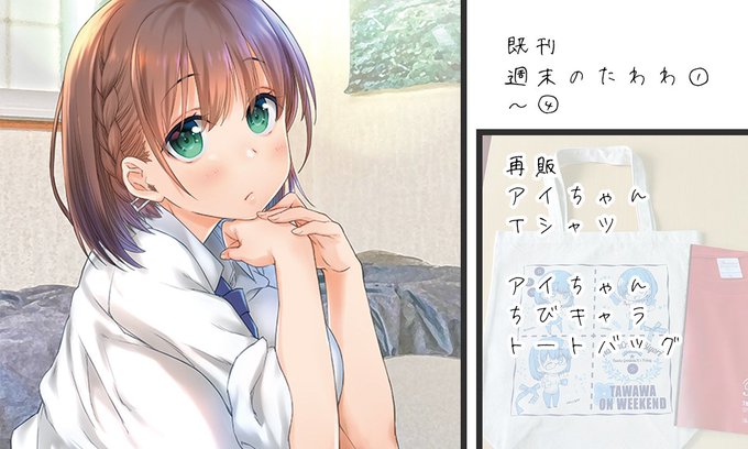 冬の出し物簡易予定★A4クリアファイルバッグ+週末のたわわ5+週末のたわわイラストレーションズ2(紙媒体会場限定)+色紙+おまけ折本 です。アイちゃんトートや冬だけどTシャツもちょっとだけ持っていきます!あとは既刊も持っていく予定です。よろしくお願いいたします。 こちらはバッグ絵柄