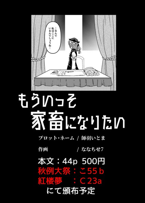 不備がなければ新刊でます!秋例大祭こ55b、紅楼夢C23aにて頒布予定です。ネームとプロットは師羽いとまさん(@Shiba_Itoma )、作画は僕みたいな感じです。印刷所からの電話に出れなかった!やばい