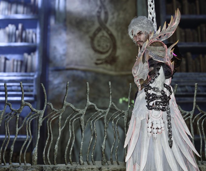 なんか綺麗めだけどめちゃ強キャラ感でる重ね着できた 衣装に合わせて髪色もちょっと変えてみた ゾ・シアの棍、羽根に見えるのもいいなー #モンハンワイルズ
