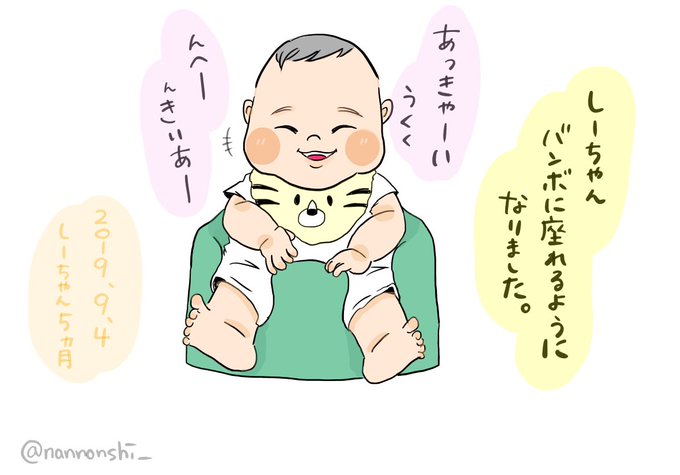 ついにバンボデビューした次女のしーちゃん。しばらく座っていられるので、本人も視界が広がって楽しそうです。もう5ヶ月…あっという間だなぁ。 #育児イラスト #育児絵日記