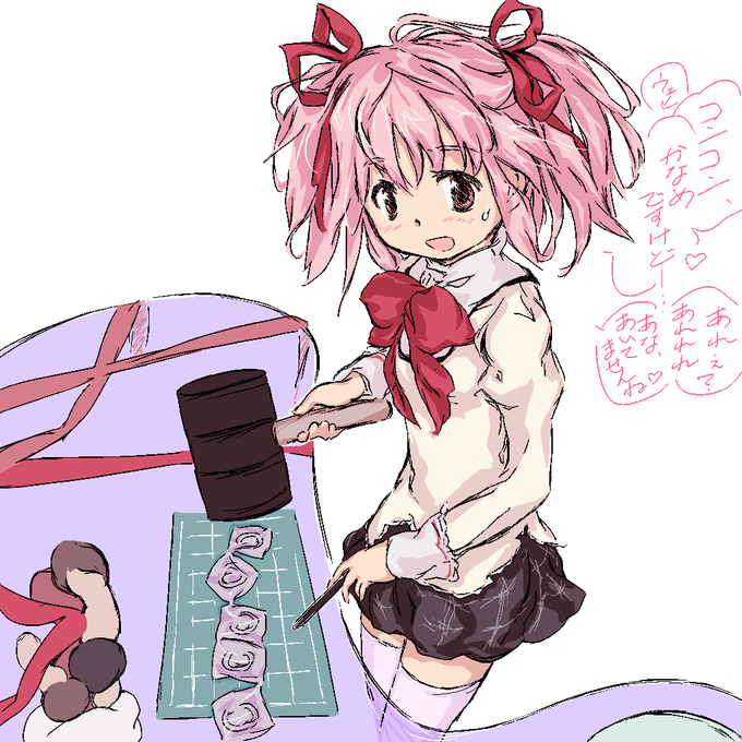 今日はお料理の実演らしい…?新鮮な食材を前になにかの包みにこんこーんと穴をあけちゃうまどかちゃん。