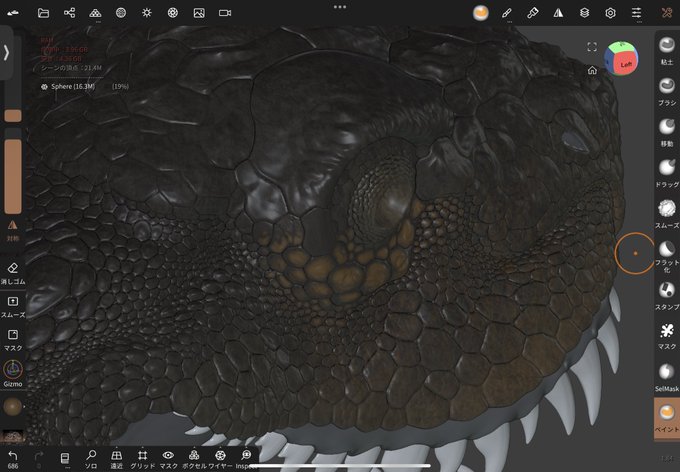 後はテクスチャ、スタンプ、色塗りまできた!! 体の中心あたりは生物感を出すためにめんどくさがらず左右非対称っぽくする💪 生物の鱗はそこまでぴっちり綺麗に並んでないし角は左右で形や長さが違う