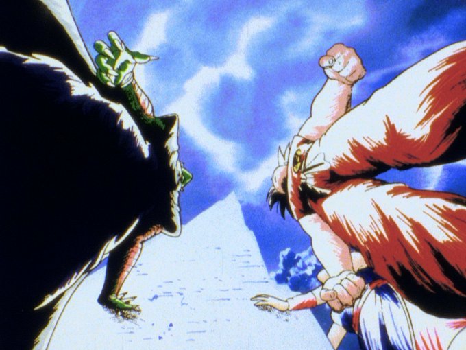 これはほんとに注意深く見ていないと判らない点なのですが、TVシリーズの色彩設計だとなぜかピッコロのターバンとマントって微妙に色が違うんですよ。 https://t.co/m9PYpuTHs6