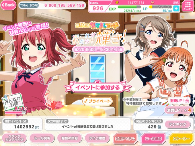今回はルビィのイベントなので、最低でも300万pt(エール編成300%のため)達成したいところですが、少し苦しいか!
