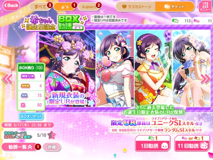 穂乃果のバースデー勧誘!BOXのほうは55連でバースデーサプライズ!衣装(初獲得)、11連チケのほうは動物ふれあい編が出てくれました🥰