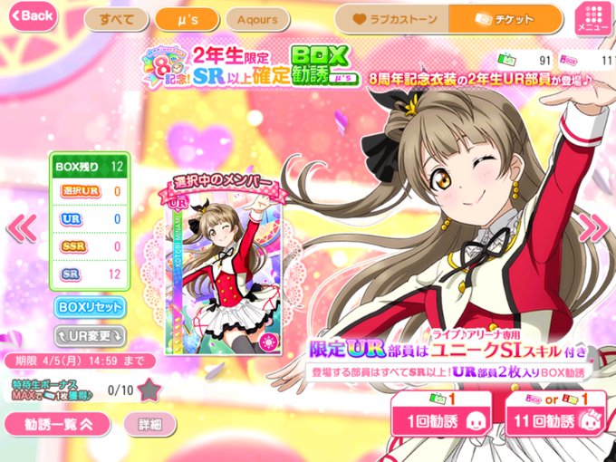 8周年記念衣装のBOX勧誘、こちらはとりあえず推しだけ引いてみることに!ということでことりを選択🐦
