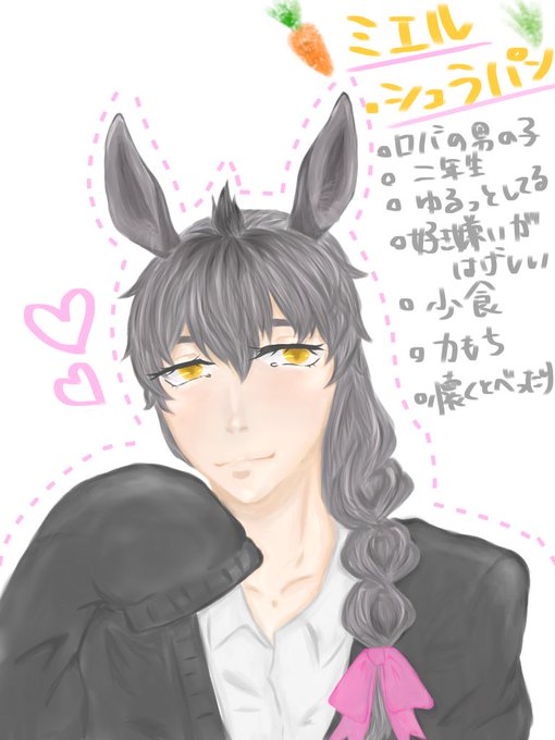 やっと出来たー!!! こなさんとかほだかさんがやっててずっと参加したくて、イラスト不慣れですが頑張って描きました! ロバのミエルくんです🥕 よろしくお願いします🙇♀️🙇♀️💕 本垢コスプレしてるのでそのうちやりたい、、、😇 #じゃが学園