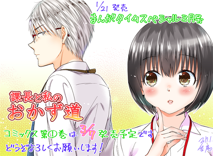 【お知らせ】1/21発売のまんがタイムスペシャル3月号にご飯4コマ『課長と私のおかず道』18話めを載せて頂いております。初単行本は3/7発売予定です!というありがたくて嬉しいフレーズとは裏腹に何だか微妙な雰囲気の二人…?な回。どうぞよろしくお願いします!