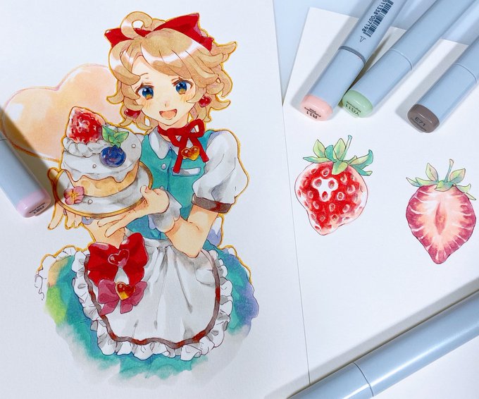 すーこさん(@jinsukou_2 )よりご著書「やさしいコピック入門」の献本を頂きました!すーこさんの技術の詰まった果物やスイーツ等の塗り方がとても細かく解説されていて、めちゃくちゃ勉強になる一冊です…!😳✨ 右→は技法書を見ながら塗った苺🍓と発売のお祝いイラストです🍰🎉