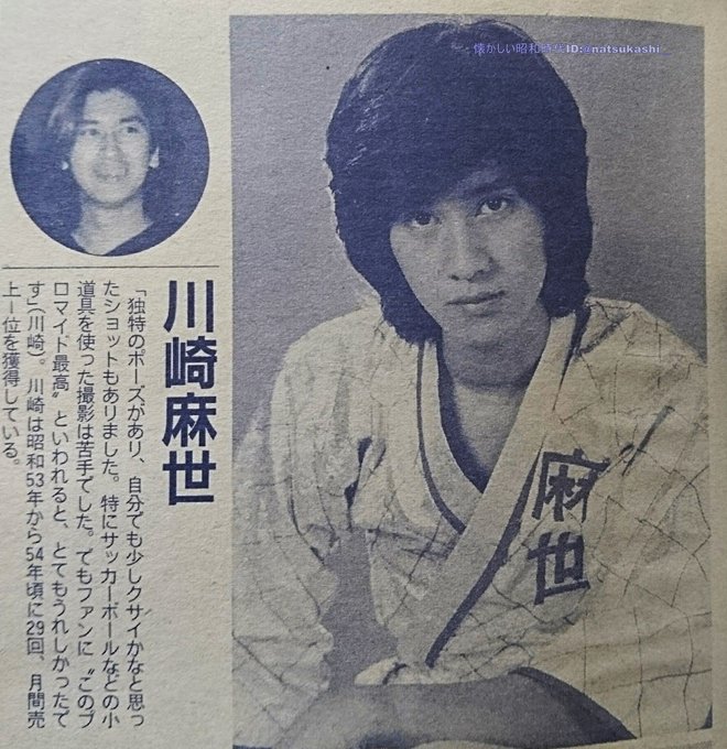 たのきん直前に出現したジャニーズのアイドル、川崎麻世。日本人離れしたイケメンっぷりと足の長さ、本当に王子様そのものだった。当時の少女漫画に出てくる憧れの先輩キャラって、麻世を模したんじゃない?飛島さんとか。いでまゆみ先生は麻世ファンでいつも作中に麻世ネタをぶっこんできたw