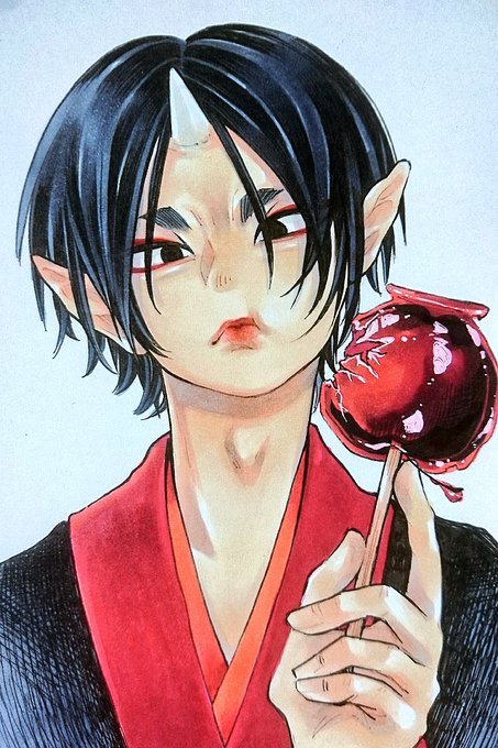 最近はぼーっとガリガリと 鬼灯様を描いてる✏② 描くたび顔がかわってく😪 りんご飴食べてる場面すき🍎💕