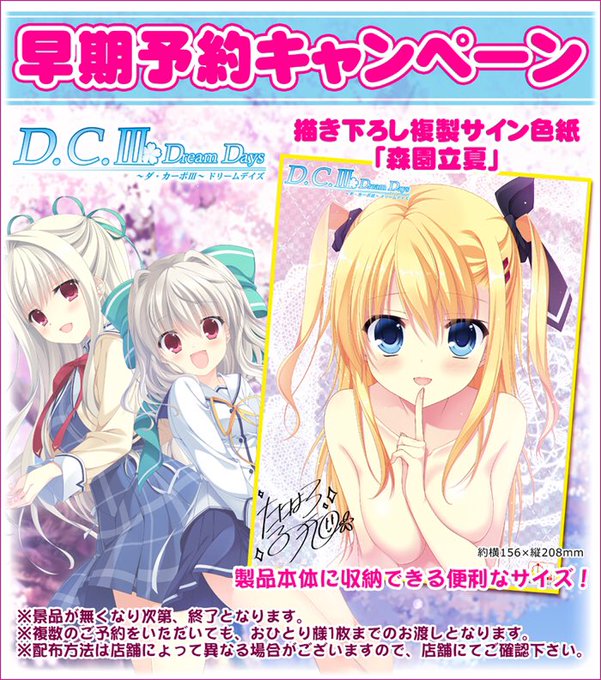 5/19から、D.C.III新作ファンディスクの予約が開始になります!描き下ろしの店舗特典画像も公開されておりますので、是非推しヒロインやお好みのシチュエーションをご確認のうえ、お好みの店舗さんでご予約頂けますとヽ(*^ω^*)ノhttps://t.co/Fep82GtqFc