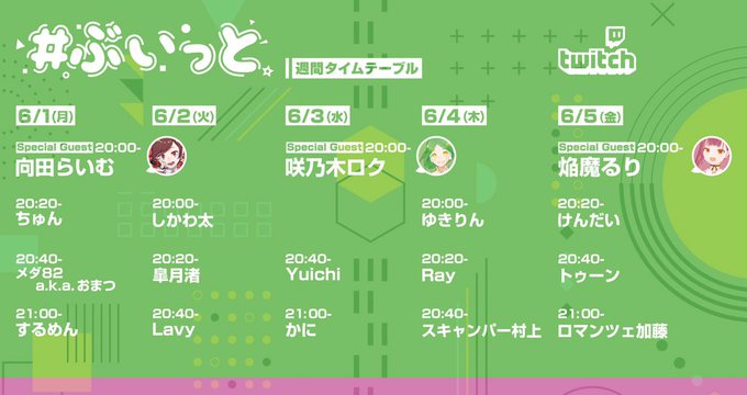 来週6/1(月)〜6/5(金)20時は #ぶいっと やります✨✨かにさんと加藤さんが出演するしゲストVtuberに #焔魔るり #咲乃木ロク とパーティはまだまだ続くぞ〜〜〜💃📱🕺