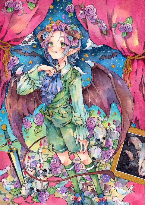 この前の絵完成しました^ ^ 🦇 #水彩