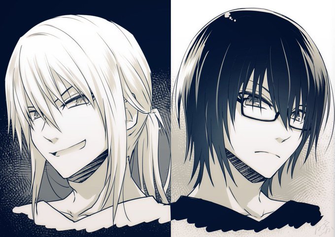 表の金髪碧眼長髪(高2)と裏の黒髪メガネ(中3)の遥、どっちが人気あるのかな…?って思いながら落書き。男性の首回りフェチなので描き込みたくなるけど裏の遥は控えめにしてます。あと目も若干大き目に描いてます #おにカノ