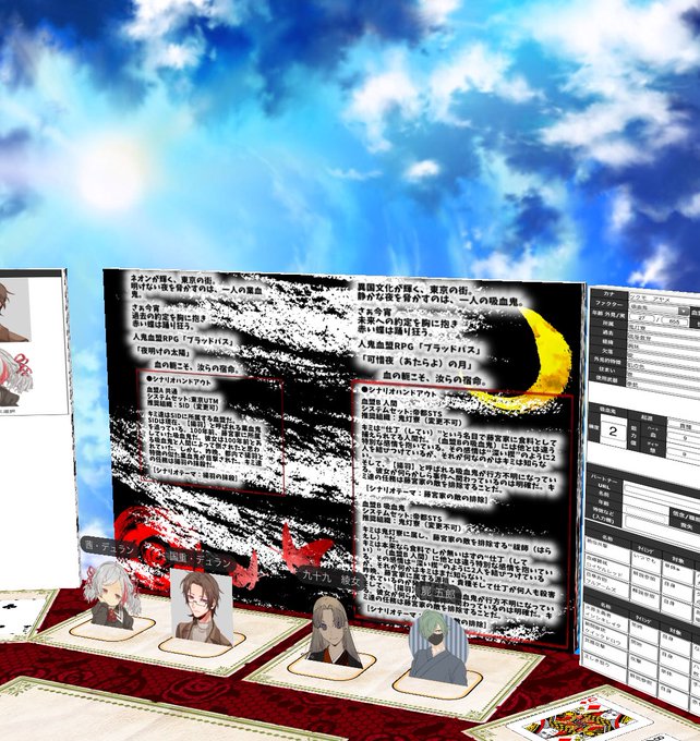 4人用のストックシナリオを急遽改変して連血鬼で継続で遊んだんですがたのしかったぁ!! ブラッドパスは付箋で3枚〜5枚+トレーラー画像だけで回しているけど、その中ではちゃんと設定を練った方(当社比)