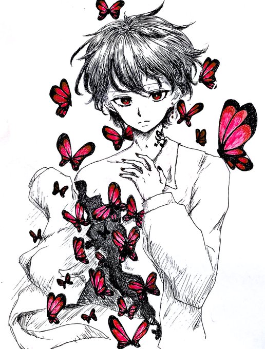 【86日目】 陽性期間中に起きては描き〜疲れて寝るして描いたやつ。右はアイビスで色相いじったやつ。個人的には青い方が好き🦋 #100日チャレンジ #ボールペン画 #アナログ