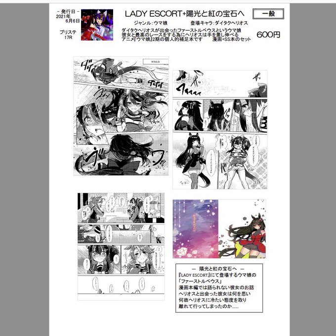 6/6 プリステ17R ウマ29 いるかのねこぱんち もう一冊、無事入稿した!多分、大丈夫!多分! 『LADY ESCORT』B5/22p 『陽光と紅の宝石へ』文庫/38p 漫画はヘリオスとオリジウマ娘とパーマーの本 文庫はオリジウマ娘とヘリオス本 分配でなくてセット売りになります、ごめんなさい赦して……理由有マス