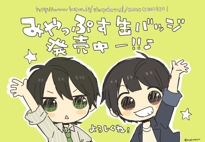 知らぬまに無事発売されてたようで! イラスト描いてるみやっぷす(@Zips3 @My_kwk_N )缶バッジ発売中みたいです!よしなに~! http://t.co/z3ihyFw32M