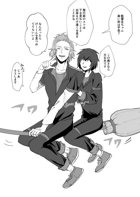 【箒の乗せ方】 ❤️🍎🐺⚡️♠️(🌲に♠️) 【4/5】 ※創作監督生がいます 飛行術の2人乗りの試験とかないのかなと 💪先生の粋な図らいで監督生に試験官役やらせてたら面白いよね 約1年ぶりのシリーズものです🙌 多分生徒は全員描く #twstプラス #ツイステプラス