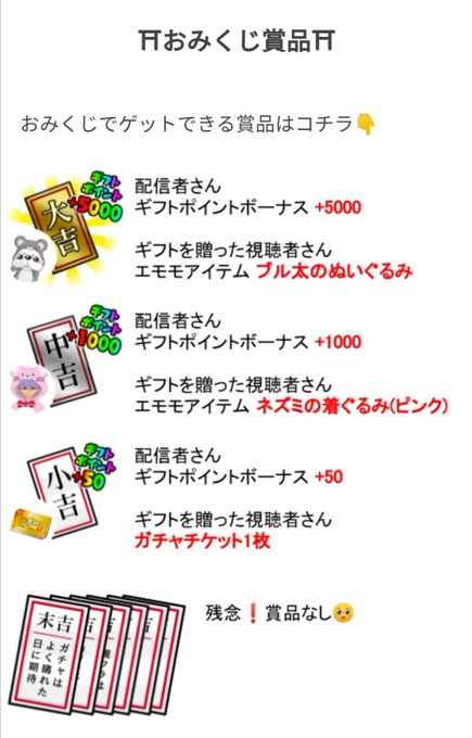 どうやらおみくじを送るといいことがあるらしい… 詳しくは下の写真をよく見てね! だから僕にギフト送ろうと思ってる人はなるべくおみくじ送ってくれると嬉しいなぁ〜!