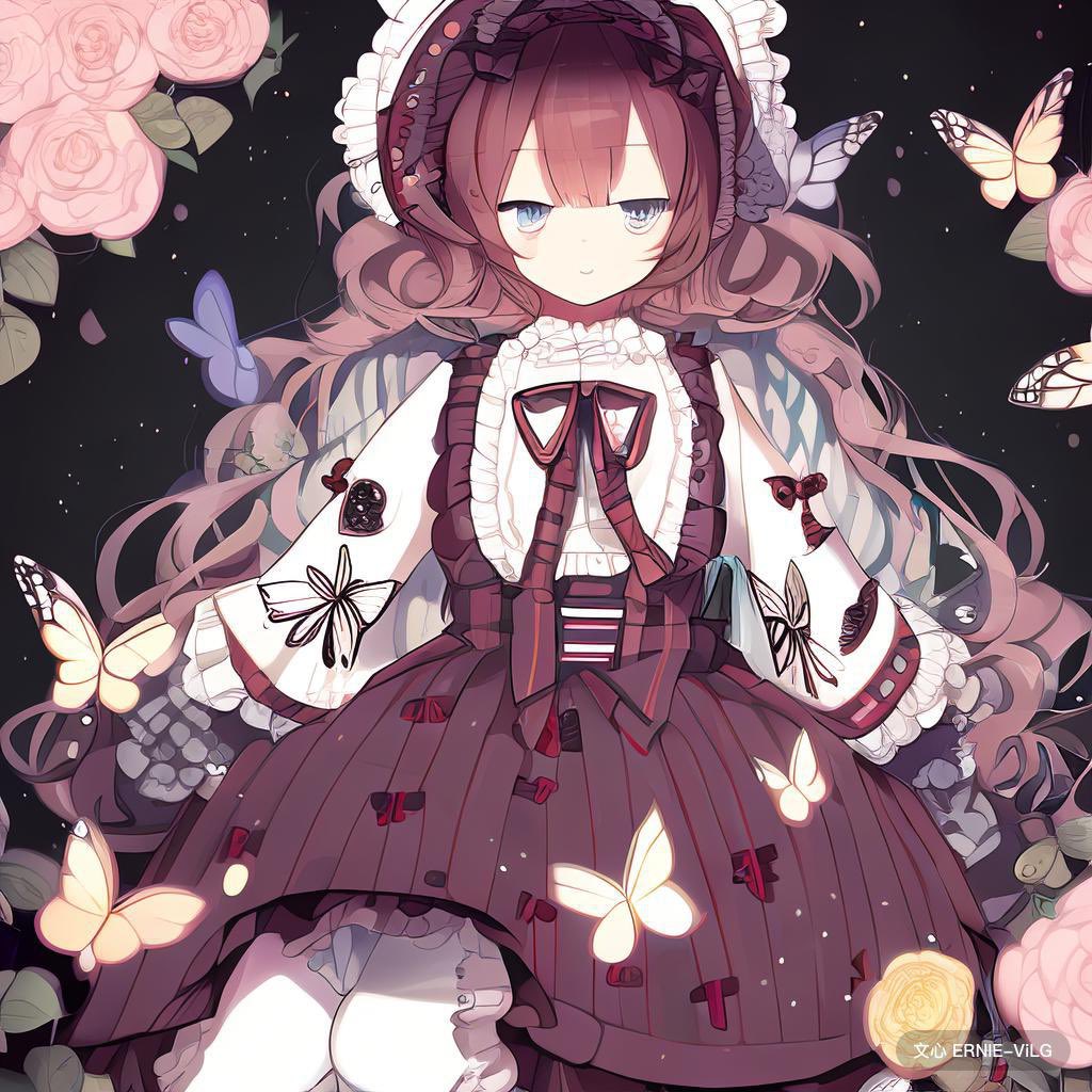 AIアートアカウント٩(ˊᗜˋ*)و フリルのついた服を着た女の子が蝶と花に囲まれているのが好き
