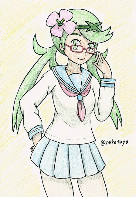 落書き投下。 ポケモンSMのマオ(セーラー服の姿)。 個人的な気まぐれで眼鏡付き。 #ポケモンサンムーン #アナログイラスト #色鉛筆