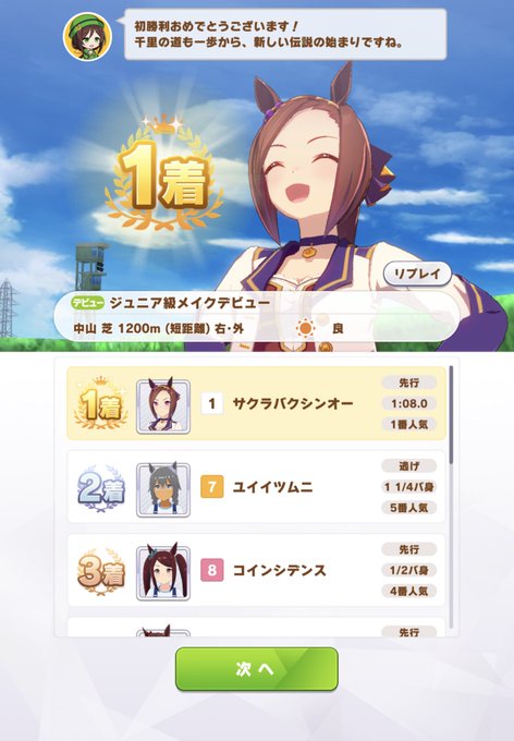 サポートガチャを引いた方が良いと聞いて20連…ふるわなかったけどSSRが1枚出たのでよしとする!あと適当に強い人をフォローして、初心者にオススメだと聞いたサクラバクシンオーでストーリー?を少し進めました。初レース1着嬉しいねー😊ただとても時間が消耗されるー😂