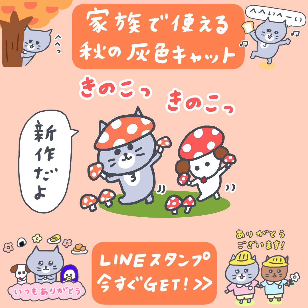 ★新作スタンプです★ 家族で使える灰色キャット第2弾! 秋のおいしいものいっぱいだよ🍄🍄よろしくおねがいします!😉💕 家族で使える秋の灰色キャット【猫】 https://t.co/xr5NZlsU7O #lineスタンプ #nemotonemo #ねもとねも #ラインスタンプ #イラスト