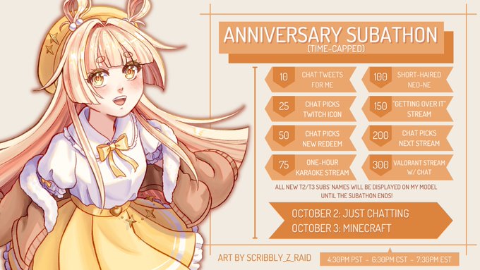 Tomorrow, an entire year of streaming and screaming as the face of Neon has passed—so I'm celebrating with a two-day subathon! 💛
