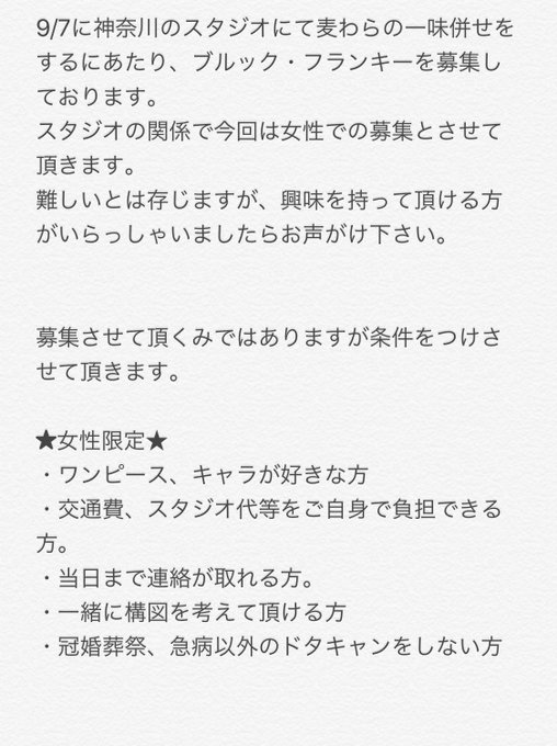 【一味募集】 麦わらの一味併せをするにあたりブルックとフランキーを募集しております。 画像をご確認頂き、ご参加頂けそうな方がいらっしゃいましたら是非お声がけ下さい。 ご検討よろしくお願いします。 ※チョッパーにつきましては人形で対応となります。