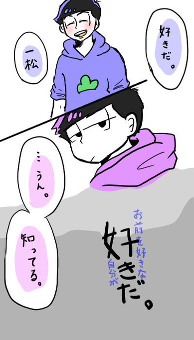 色松を応援するけど長男ポジは譲らないおそ松と、好きな人(いっち)には弱味見せたくないから兄さんを頼ってしまうカラ松と、そんな二人を見ておそ松兄さんには敵わないと諦めてる一松、みたいなトライアングルがすき。♪きーみはー誰とーキー文字数