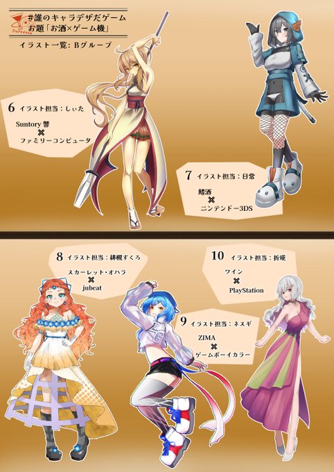 #誰のキャラデザだゲーム に参加しました。お題は「お酒×ゲーム機」です。僕はBグループになります! どれが俺のデザインか予想してみてください!(アンケートはツリーにあります)