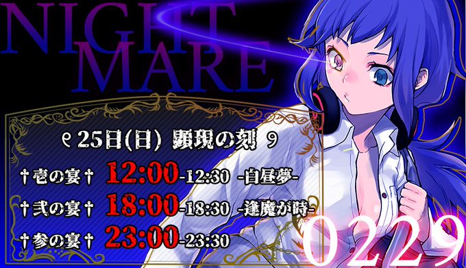 明日の顕現の刻を変更した では、夢でまた逢おう †壱の宴† 12:00-12:30 -白昼夢- †弐の宴† 18:00-18:30 -逢魔が時- †参の宴† 23:00-23:30 #言霊少女