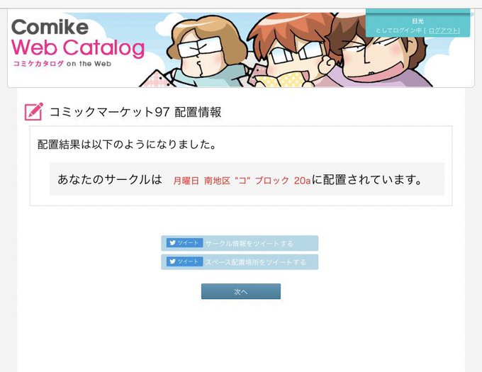 あなたのサークル「齧られたビート板」は、コミックマーケット97で「月曜日南地区 "コ " 20a」に配置されました!コミケWebカタログにてスペース配置場所公開中!https://t.co/Vctl9nsSsL #C97WebCatalog