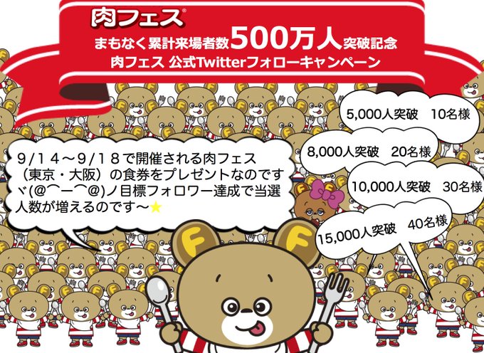 くーちゃんをフォロー&RTしてくれたみんなに、現在開催中の肉フェス(東京・大阪)で使える食券10枚が当たるのです🎁次は8000人...お友だちできるかなぁ🐻💞