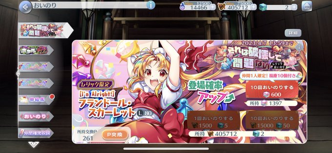 (‘、3_ヽ)_(260連でレリックフランちゃんお迎え完了…(ここまで来たらいっそ天井逝けよとは思った(イイモン…頑張って育成して活躍させてあげるモン…マジカルメガトンメイスでドカーンすっるぞぉ〜…