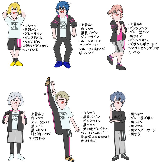 自分用にダンキラみんなのジャージ描きました。 タオルは本来ケツ側にインしてるけど、見て分かりやすくしたくて前に描いてます。 参考にできる方は参考にしてください。 最後のコメントはわたしの妄想です。 まともに描いたキャラは一人としていないので注意してください。