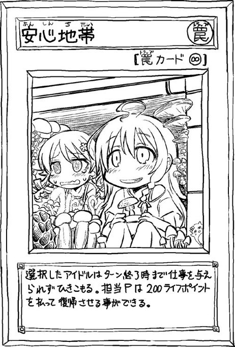 遊戯王ろくに知らないぼくが考えたデレマス版遊戯王シリーズその6、星輝子森久保乃々で「安心地帯」。そのまま安全地帯でも良かったけど今のとこ最低でも一文字は変えてきてるので変えました。