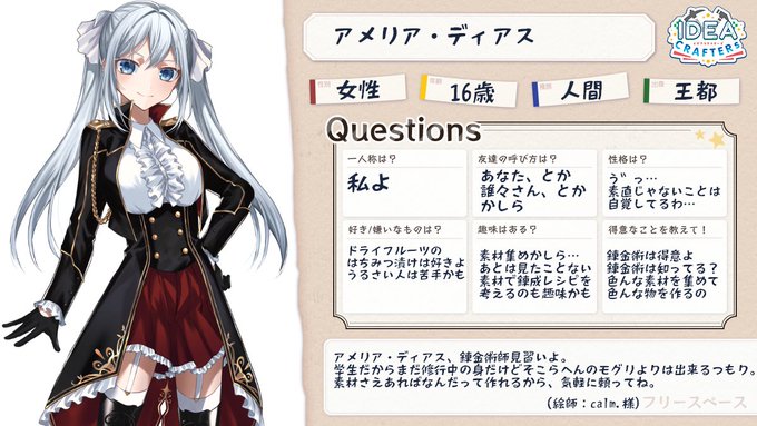 アメリアの新立ち絵が届いたのでイデクラキャラシを更新! フリースペースとかも少しだけ内容変更。 立ち絵はSKIMAでcalm.様に描いて頂きました! #イデクラキャラクターシート @ic_wall
