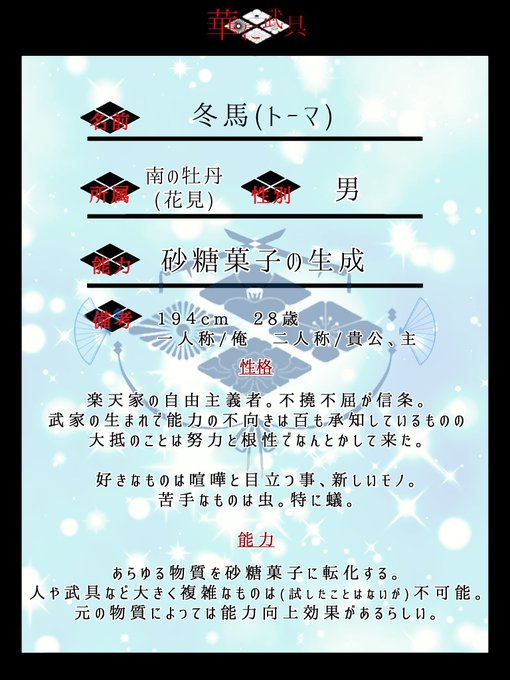 素敵な企画様【@Hananibugu】にこっそり参加させて頂きます。南の牡丹、武士。派閥・所属関係なくまったりお話しさせていただけたら幸いです。お手柔らかによろしくお願いします~。 #華に武具 #華に武具_CS #華に武具_牡丹 #華に武具_武士
