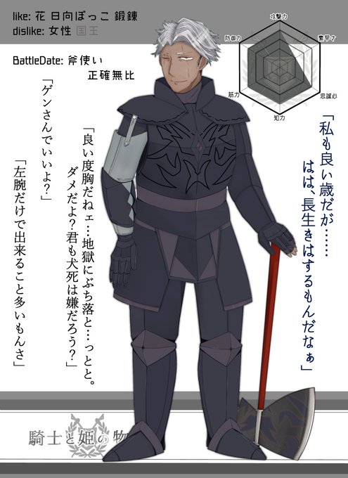 @kishihime_kabe 【@Kishihimegatari 】様に隻腕隻眼のおじさん騎士にて失礼致します。ゆったりになりますがお守りさせて頂く姫様はじめ友好険悪問わず交流していただけましたら幸いです。何卒よしなに~ #騎士と姫の物語 #騎士姫_CS #騎士姫_騎士