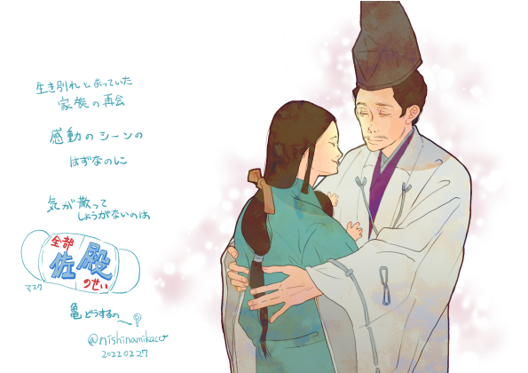 第5回、2枚目。佐殿〜?! 江間次郎のタイミングがよすぎて、実はとっくに帰宅していて彼が来てるのも気付いてて多少のことはと知らんふりしてたものの上がり込んだのでさすがに声かけたとかある…? 泣いちゃうのかわいそうだった #殿絵 #鎌倉殿絵